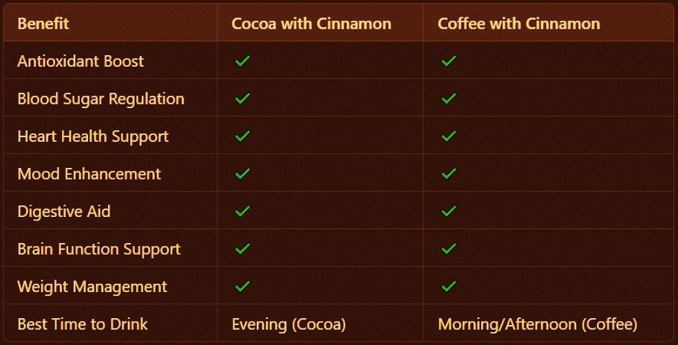 Mixing cinnamon with cocoa and coffee provides powerful health benefits due to their complementary properties. While cinnamon-cocoa milk can be enjoyed as a relaxing, antioxidant-rich bedtime drink, cinnamon coffee makes a perfect morning boost for cognitive function and metabolism. Both combinations deliver essential vitamins and minerals, helping with everything from blood sugar regulation to improved mood and digestion.